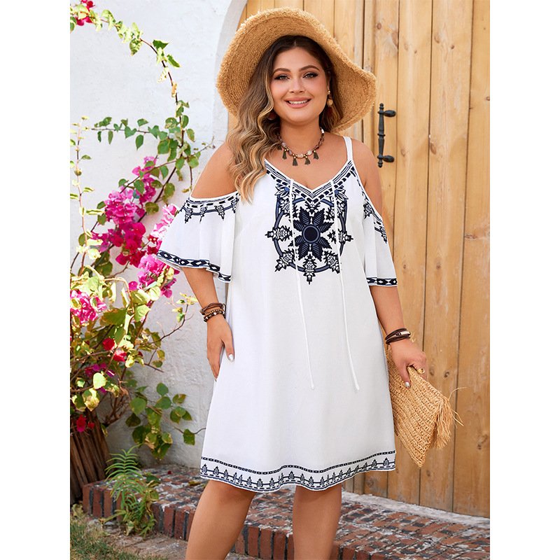 This stylish off-shoulder dress is perfect for your summer getaways. Made from high-quality polyester, it offers both comfort and breathability, ensuring you stay cool during sunny days. The geometric pattern adds a trendy touch, while the V-neckline complements your figure beautifully.