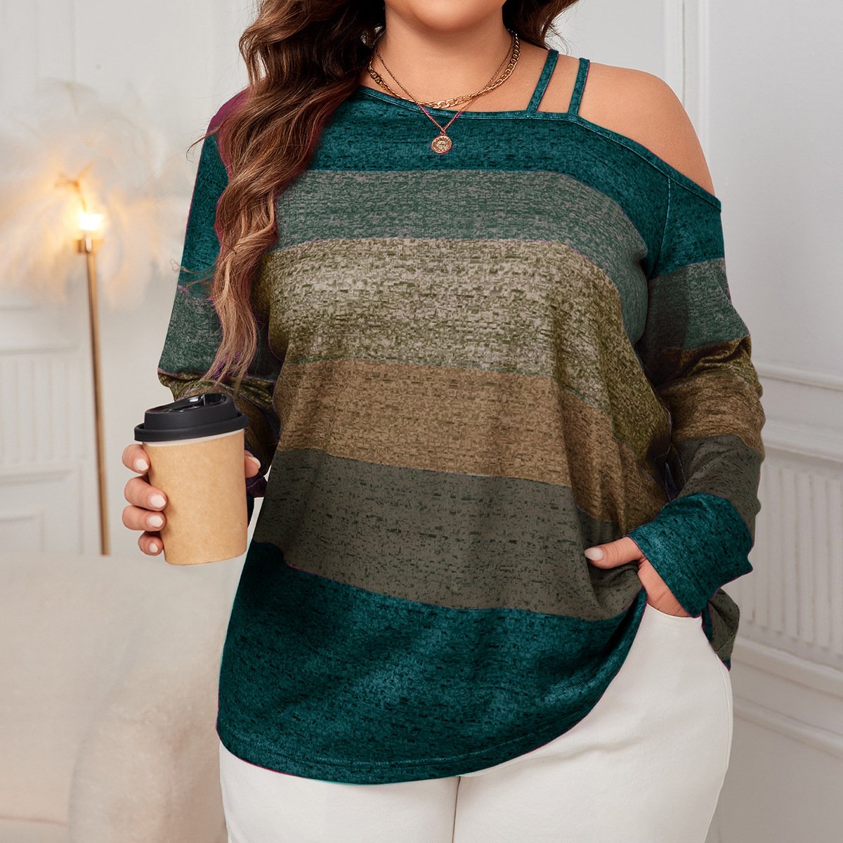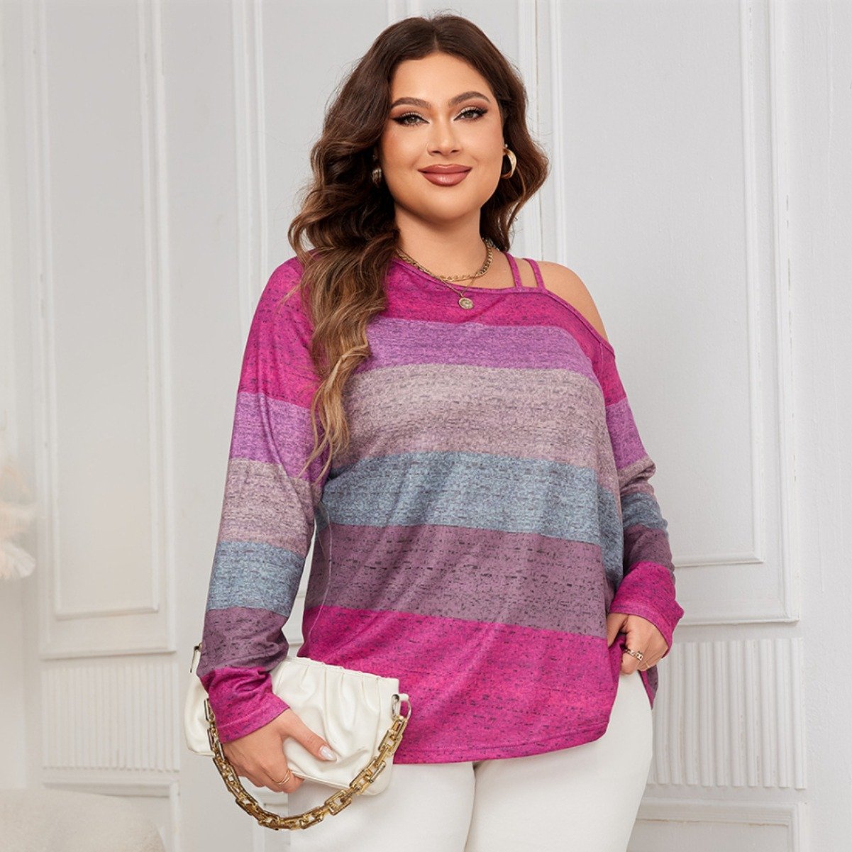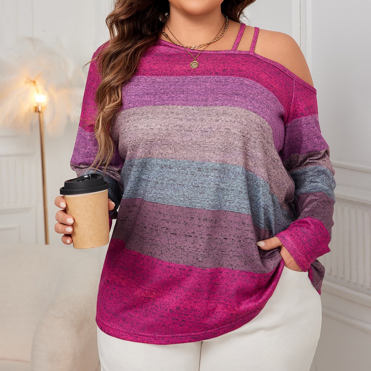 This blouse is a great addition to any wardrobe. Its unique off-shoulder design and color block pattern add a contemporary touch while ensuring comfort throughout the day. Suitable for both office wear and casual outings, it pairs well with skirts or jeans for a chic appearance.
