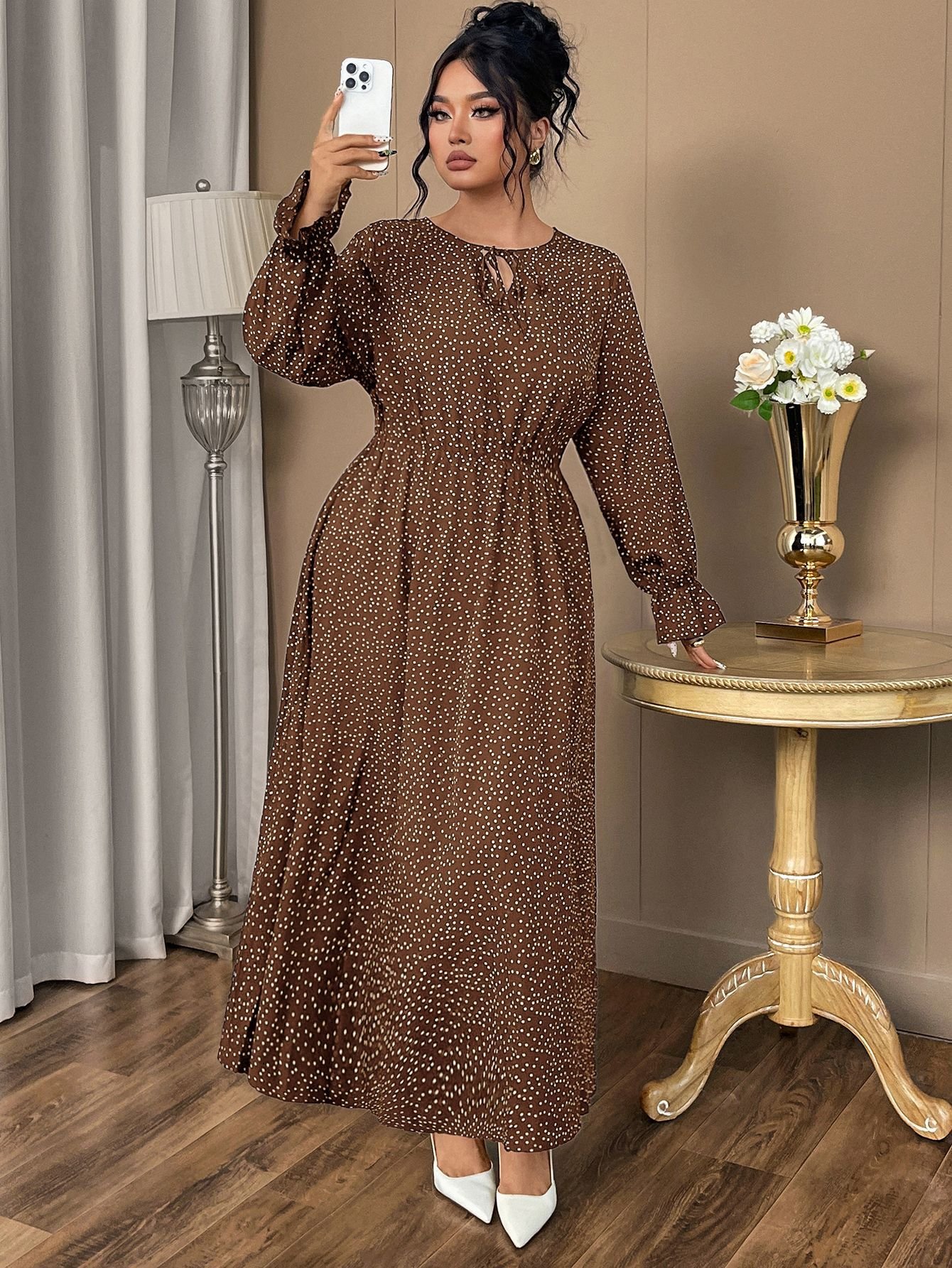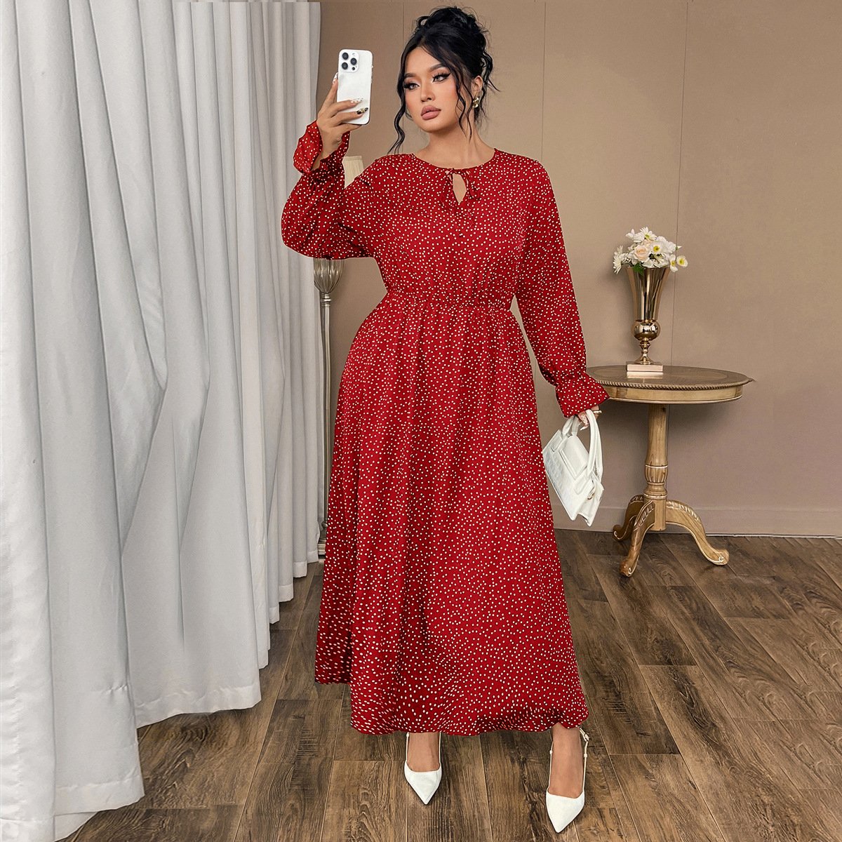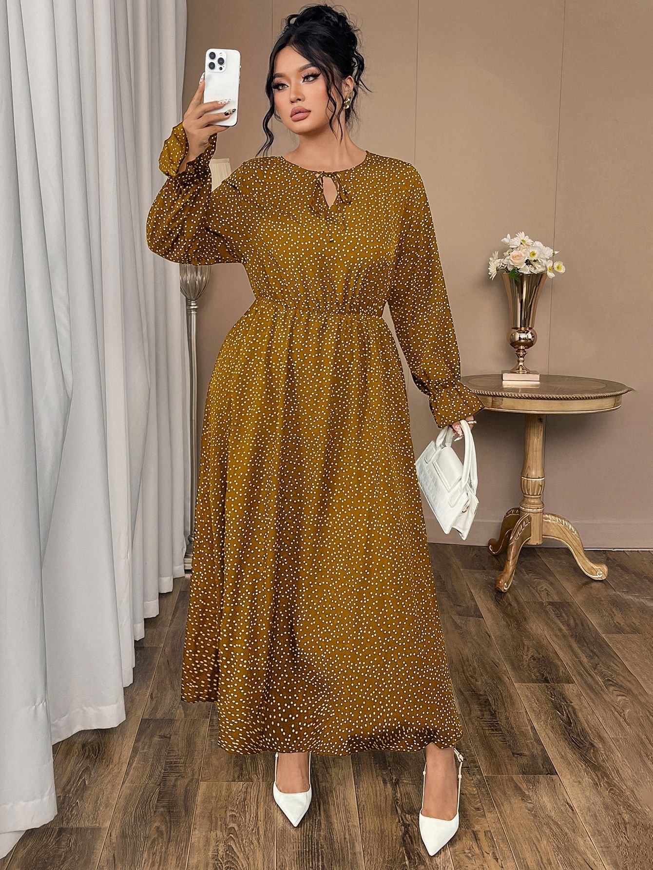 This stylish and comfortable plus size dress features a chic polka dot pattern, making it perfect for a range of occasions. The dress is crafted from lightweight chiffon, ensuring a flattering fit for curvier figures.