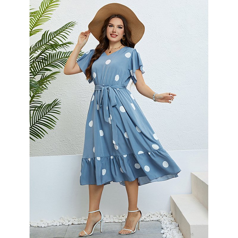 This stylish V-neck dress features a flattering tie waist design, perfect for a chic summer look. The cute polka dot pattern adds a touch of fun and femininity to your wardrobe. Made from high-quality polyester, this dress offers comfort and durability for everyday wear. Its A-line silhouette and ruffled sleeves create a fresh, sweet look that complements various occasions.